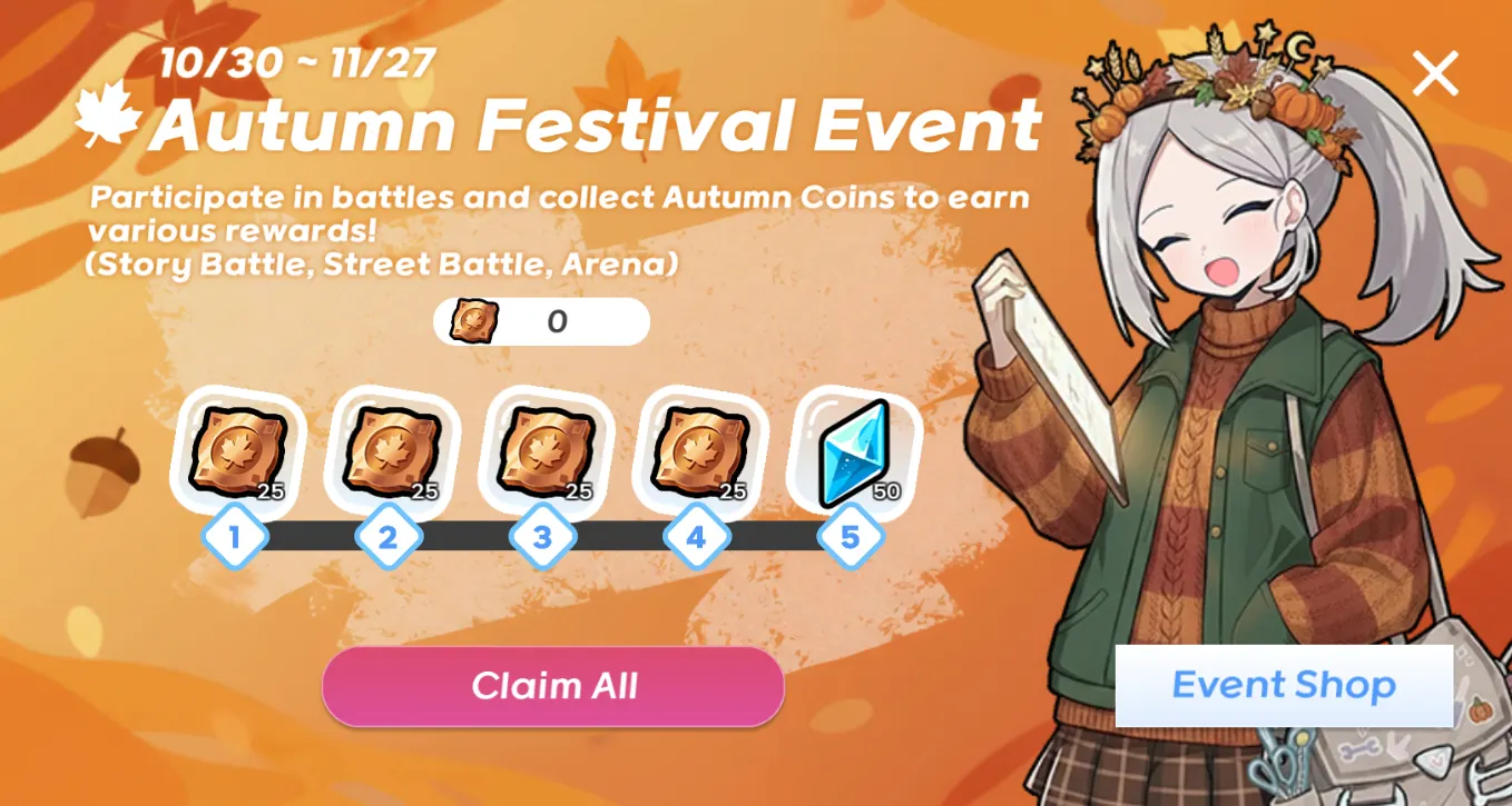 Play the game and collect Autumn Coins! (Story Battle, Street Battle, and Arena only)