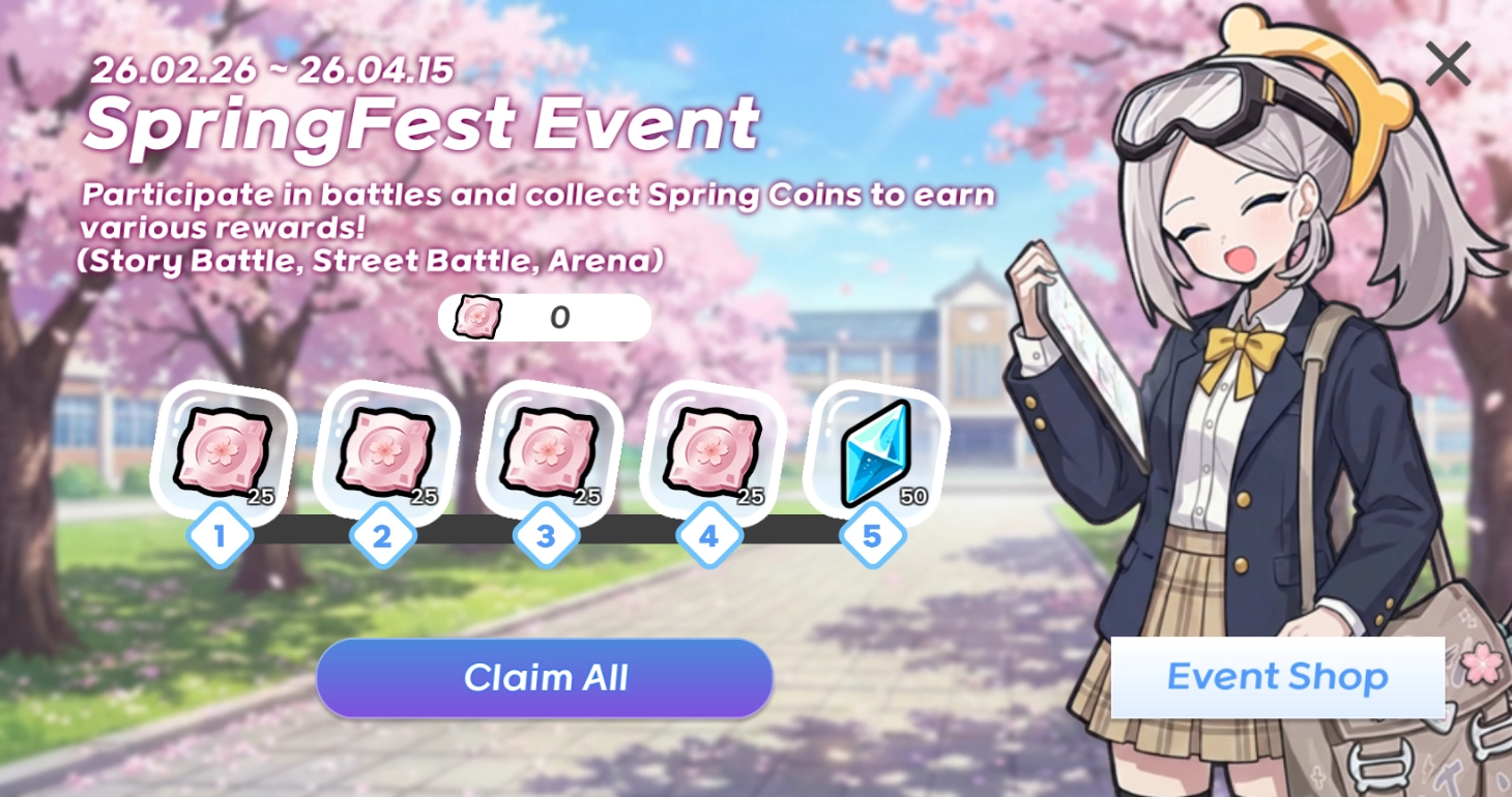 Play the game and collect Spring Coins! (Story Battle, Street Battle, and Arena only)
